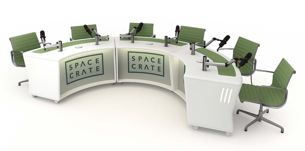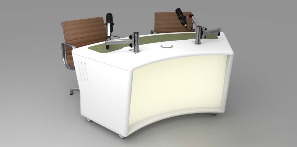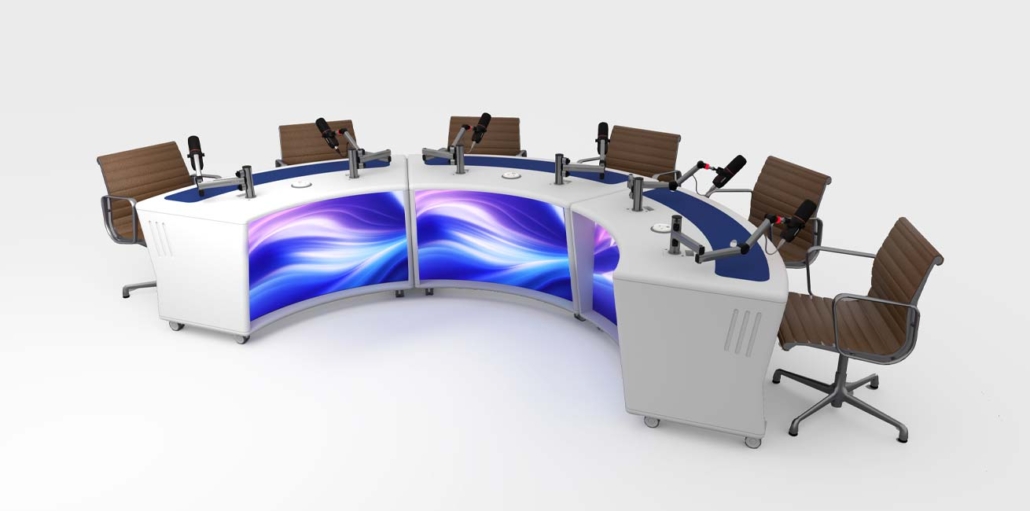 AKA designed and manufactured a custom 4-person podcast desk, featuring integrated lighting and a built-in display screen positioned within the front fascia for maximum visibility and impact.