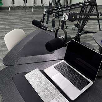 Our small podcast desk the ProVoice V1 is designed for flexibility, functioning perfectly as a single workstation or combined with additional desks to accommodate up to six people. Each desk features a real wood veneered desktop with inlaid acoustic fabric pads to enhance sound quality, along with an integrated cable management system to keep your workspace tidy. The desktop is supported by a heavy-duty steel frame, providing a robust and stable foundation for professional podcasting or streaming setups.